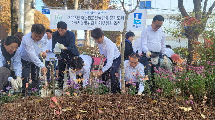 사진/대한전문건설협회 경기도회 수원시운영위원회 회원들이 손바닥정원을 조성하고 있다.(사진제공=수원시)