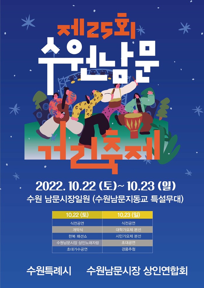 제25회 수원남문 거리축제가 10월 22~23일 남문시장 일원에서 개최된다. 개막식은 22일 오후 5시 팔달문 지동교 특설무대에서 열린다.