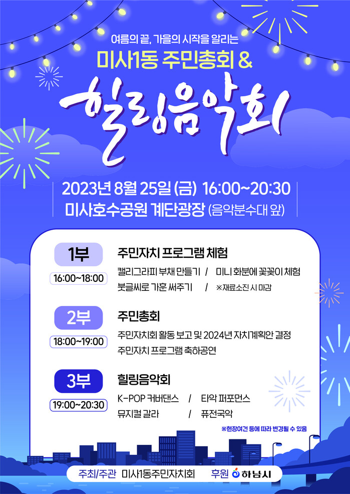 하남시 미사1동 주민자치회가 오는 8월 25일(금) 18시부터 미사호수공원 계단광장에서 주민총회 및 힐링음악회를 개최한다.