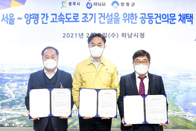 이날 공동건의문 채택에는 신동헌 광주시장과 김상호 하남시장, 정동균 양평군수가 참석해 3개 시·군이 연계되는 국책 도로사업인 ‘서울∼양평 고속도로’ 예비타당성조사의 조속한 통과를 한 목소리로 건의했으며 고속도로 조기 건설을 추진하기 위한 공동건의문에 서명했다.