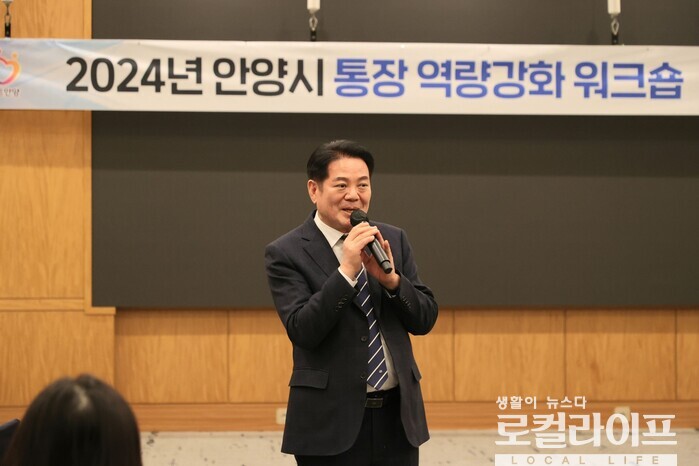 | ▲ 최대호 안양시장이 ‘2024년 안양시 통장 역량강화 워크숍’에 참석해 인사말을 하고 있다. (사진출처=최대호 페이스북) |