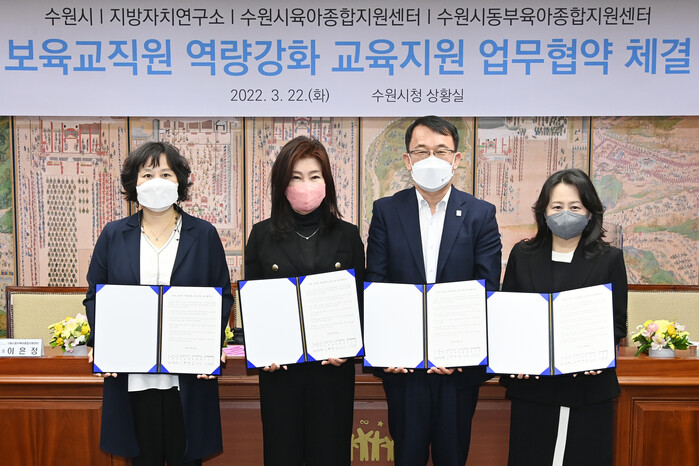 수원시와 지방자치연구소(주)·수원시육아종합지원센터·수원시동부육아종합지원센터는 22일 시청 상황실에서 ‘보육교사 교육사업 지원 업무협약’을 체결하고, 수원시 보육 교직원 역량 강화를 위한 교육사업에 협력하기로 했다.