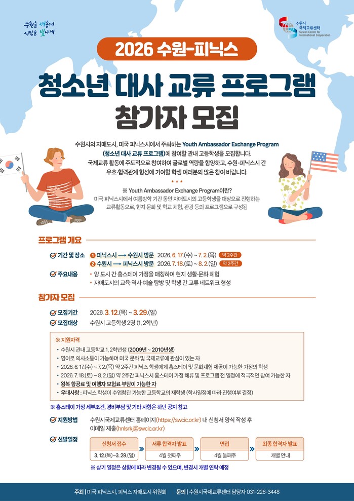 수원시국제교류센터는 수원시 국제자매도시인 미국 피닉스시와 추진하는 ‘2026 수원-피닉스 청소년 대사 교류 프로그램’에 참여할 수원시 고등학생 2명을 3월 29일까지 모집한다.