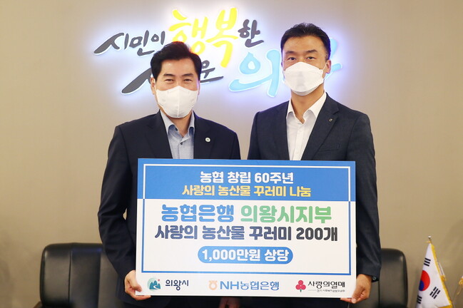NH농협은행 의왕시지부(지부장 한명호)는 지난 13일 농협 창립 60주년을 기념하여 1,000만원 상당의 사랑의 농산물 꾸러미를 의왕시에 전달했다.