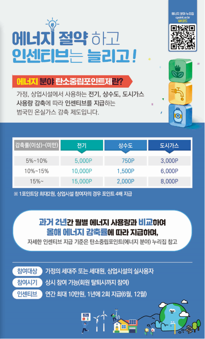 ‘탄소중립포인트제(에너지)’는 가정·상업시설 등에서 에너지(전기·상수도·도시가스) 사용량을 줄이면, 감축률에 따라 인센티브를 부여하는 전 국민 온실가스 감축 실천 제도다. 가정과 상업시설이 참여할 수 있다.