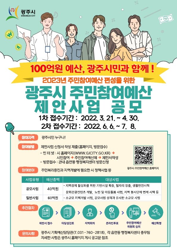 자세한 내용 및 신청 서식은 광주시 홈페이지 내 ‘시민참여-주민참여예산제-알림마당’에서 확인할 수 있으며 문의는 광주시 기획예산담당관(760-2818) 또는 각 읍‧면‧동 행정복지센터로 하면 된다.