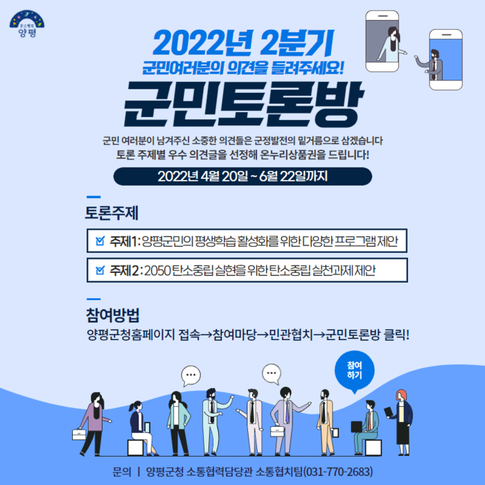 양평군(군수 정동균)에서는 4월 20일부터 6월 22일까지 약 두달간 군 홈페이지를 통해 2022년 2분기 온라인 군민토론방을 운영한다고 밝혔다.