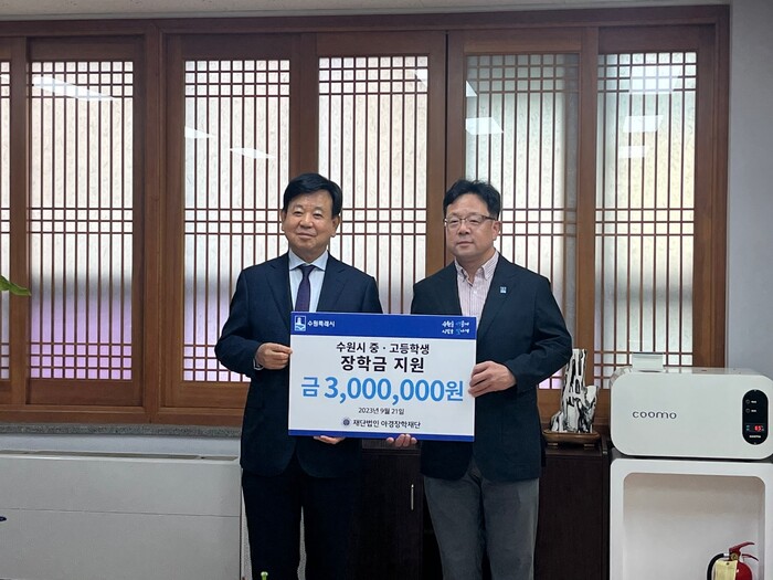 아주대학교 공익 재단법인 아경장학재단이 21일 “수원시 취약계층 중·고등학생 장학금으로 사용해달라”며 장학금 300만 원을 수원시에 전달했다.