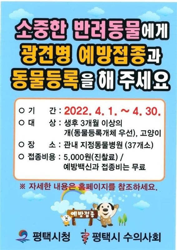 평택시는 인수공통전염병인 광견병 예방을 위해 4월 1일부터 30일까지 한 달 동안 관내 개, 고양이를 대상으로 광견병 예방백신 일제접종을 실시한다고 밝혔다.