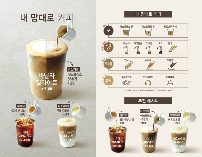 에스프레소 샷, 리스트레또 샷, 콜드브루 원액 중 선택해 샷을 추가할 수 있으며, 바닐라, 헤이즐넛, 카라멜 등을 포함한 5가지 시럽 소스를 기호에 따라 추가할 수 있다. 뿐만 아니라 연유, 카라멜, 초콜릿 3가지 드리즐과 초코블라썸, 아이스크림, 휘핑크림 3가지 토핑을 활용해 100여 가지의조합으로 커피를 만들 수 있다. 이를 통해 소비자들은 기존 판매하던 커피 메뉴에서 다양한 옵션을 추가할 수도 있을뿐더러 아예 새로운 나만의 커피 메뉴를 완성해 즐길 수도 있다.