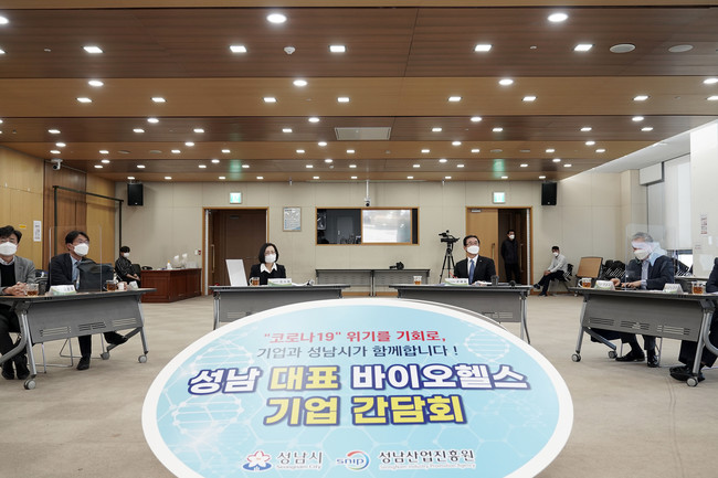 [로컬라이프] 성남시는 12일 오전 11시 성남시청 한누리실에서 코로나19 관련 우수기업을 격려하고 현장의 의견을 시 정책에 반영하기 위해 성남을 대표하는 13개의 바이오헬스 기업과 간담회를 개최했다.