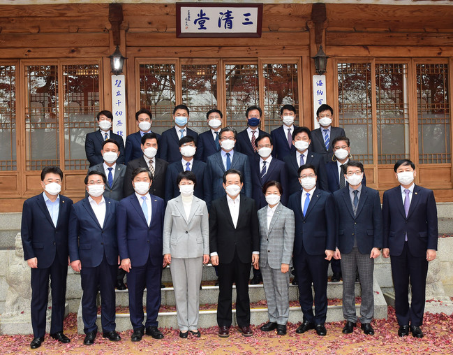 사진/염태영 시장(앞줄 오른쪽 3번째)과 참좋은지방정부협의회 회장단이 정세균 총리(앞줄 가운데)와 기념촬영을 하고 있다<수원시청 제공>