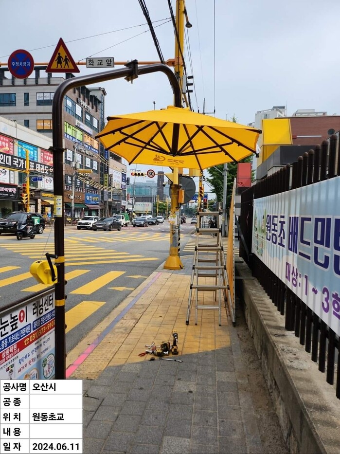 [오산=로컬라이프] 송준형 기자 = 오산 원동초등학교 앞에 노랑 그늘막을 설치했다.
