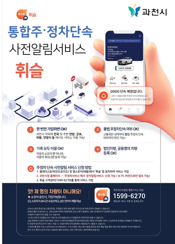 과천시는 오는 5일부터 불법 주‧정차 근절과 원활한 교통 환경 조성을 위해 단속 전 운전자의 스마트폰으로 위반 사실 및 단속 대상임을 알려주는 ‘통합 불법 주‧정차 단속 사전알림서비스’를 시행한다고 밝혔다.