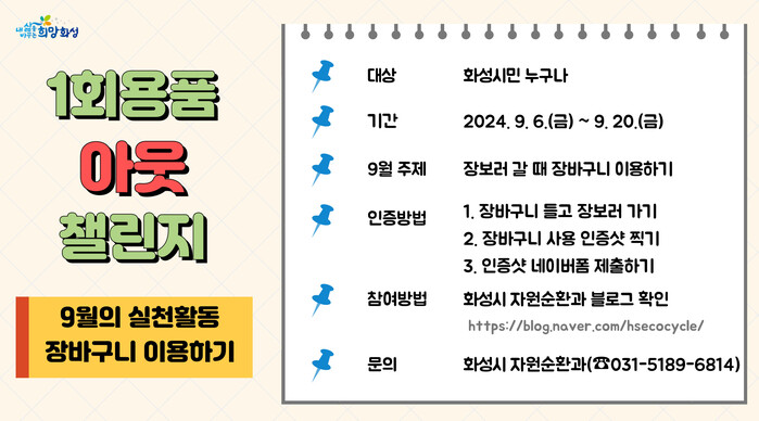 화성시(시장 정명근)가 환경오염 예방 및 1회용품 사용 줄이기 문화 확산을 위해 12월까지 ‘1회용품 아웃 챌린지’를 운영한다고 12일 밝혔다.