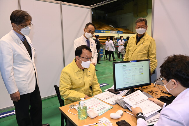 사진/조청식 제1부시장이 예방접종센터를 점검하고 있다. (사진제공=수원시)