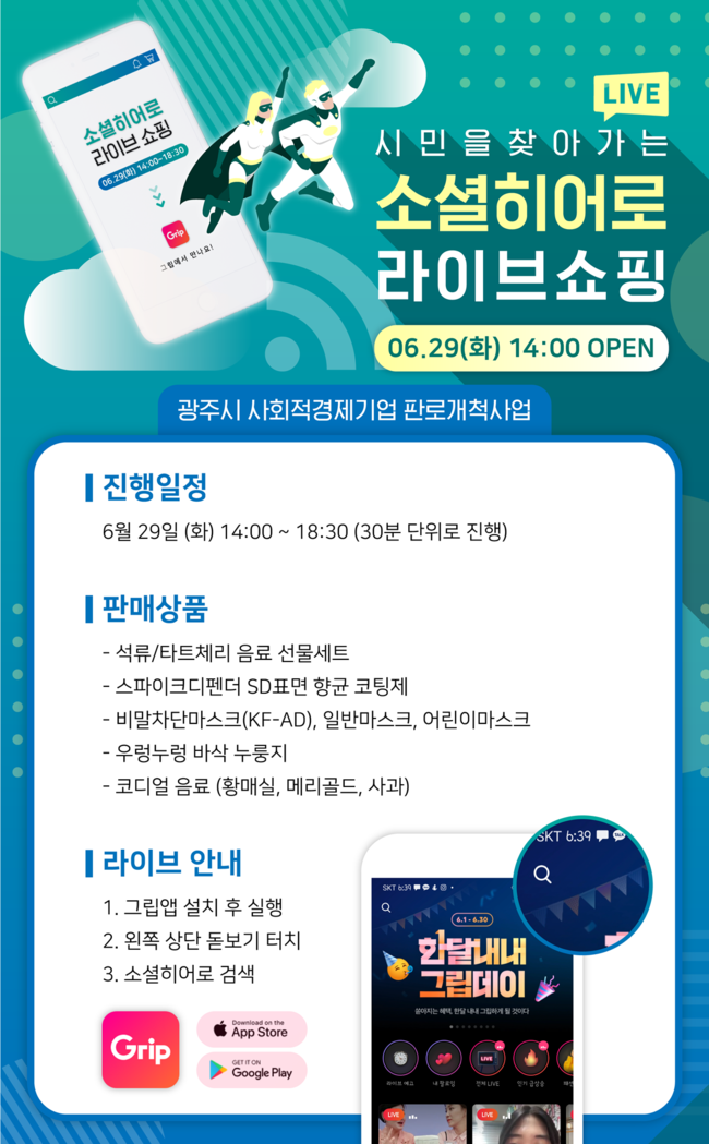 광주시가 사회적경제기업 판로개척을 위한 비대면 판매행사인 라이브커머스 특별판매전 ‘소셜히어로 라이브 쇼핑전’을 오는 29일 오후 2시부터 라이브쇼핑 전문 어플리케이션 채널을 통해 연다. 라이브커머스는 스마트폰에서 그립앱 설치 후 소셜히어로를 검색하면 광주시 특별판매전에 참여할 수 있다.