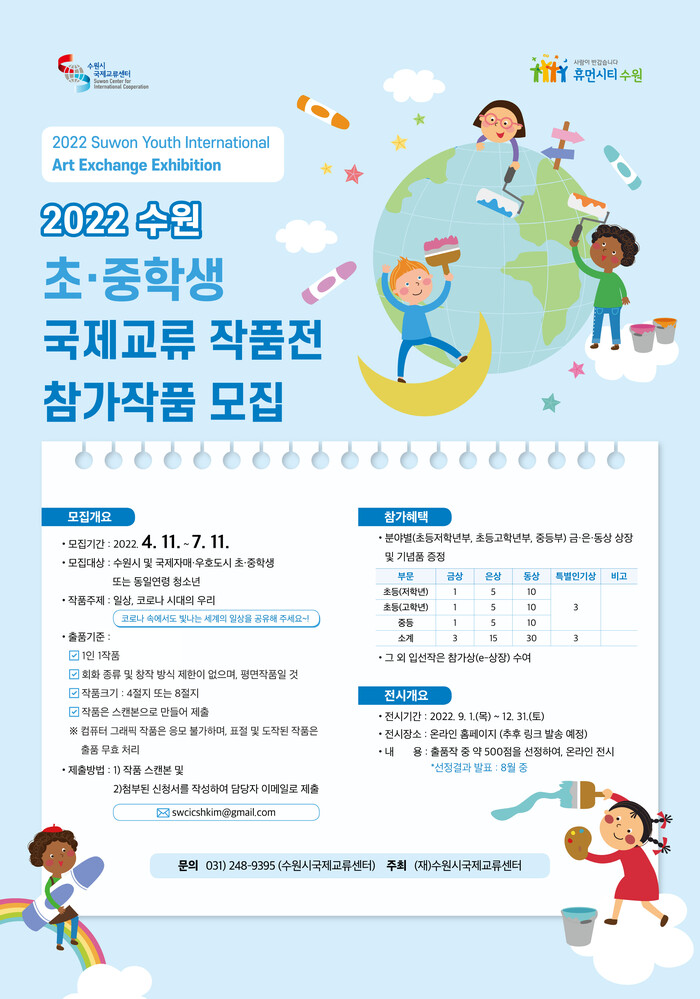 수원시국제교류센터는 7월 11일까지 ‘2022 수원 초·중학생 국제교류 작품전’에 참가작품을 공모한다.