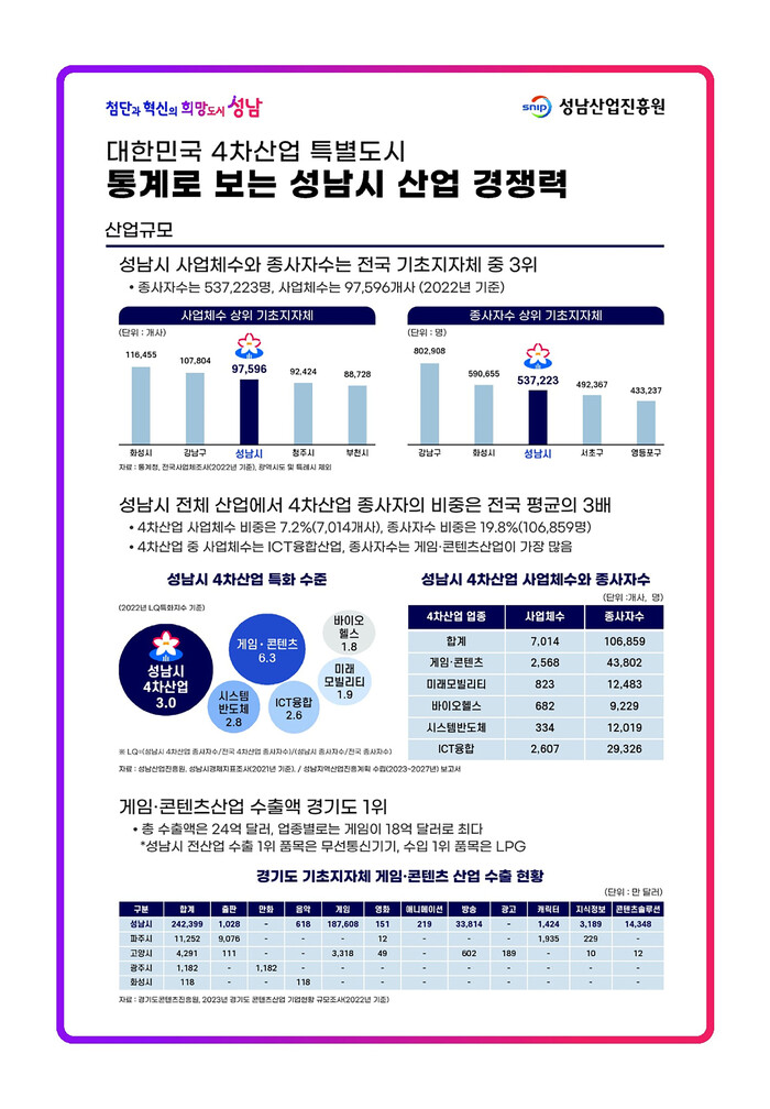 한편, 게임‧콘텐츠, ICT융합, 미래모빌리티, 바이오헬스 등 성남시 4차산업 종사자는 총 10만6859명으로 집계됐다. 성남시 전체 산업에서 4차산업 종사자의 비중이 19.8%를 차지해 이는 전국 평균의 3배에 이르는 것으로 나타났다. 특히 게임‧콘텐츠 업종 종사자 비중은 전국 평균의 6.3배에 달했다.