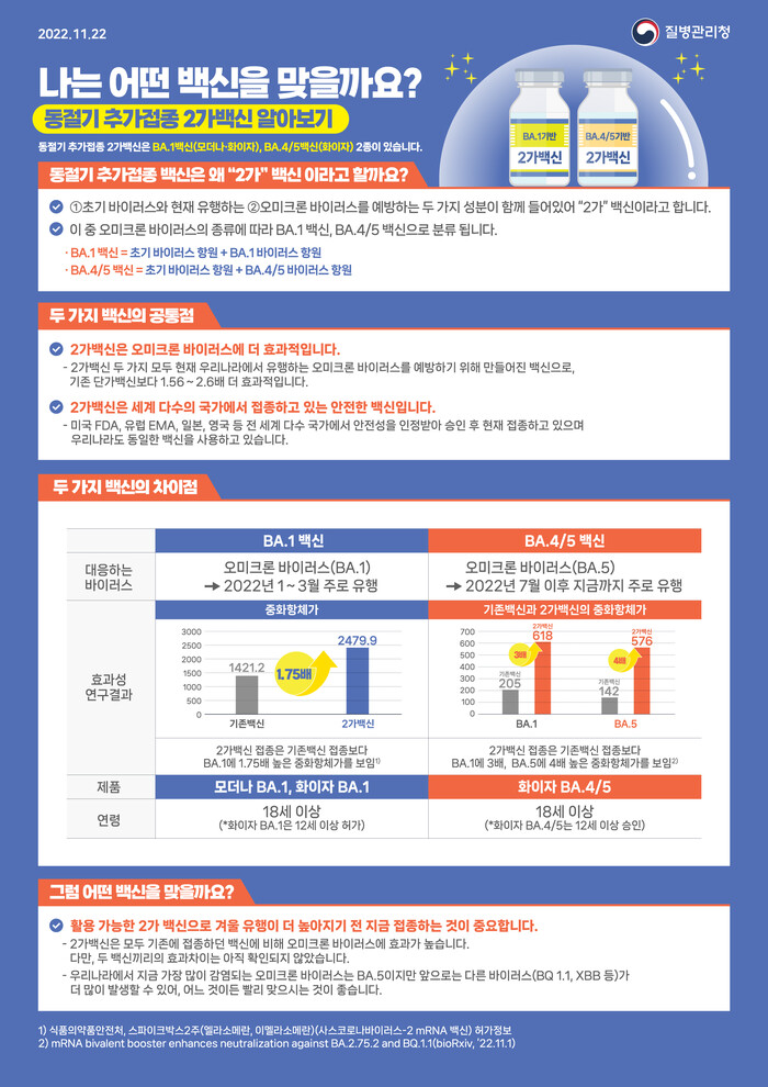이번 접종에는 오미크론 변이에 대응하는 mRNA 2가 백신 3종(화이자BA.1, 화이자BA.4/5, 모더나BA.1)이 활용된다.