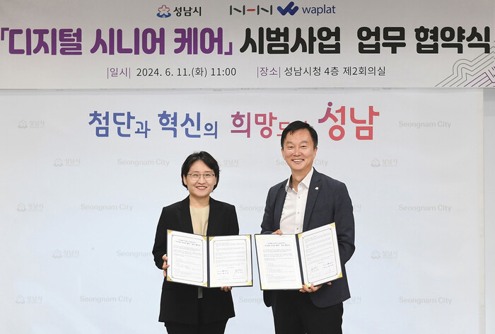 시는6월11일 오전11시 시청4층 제2회의실에서 이진찬 성남부시장과 황선영 와플랫 대표이사,노인종합복지관 관장 등이 참석한 가운데‘디지털 시니어케어 시범사업 시행을 위한 업무협약’을 했다.