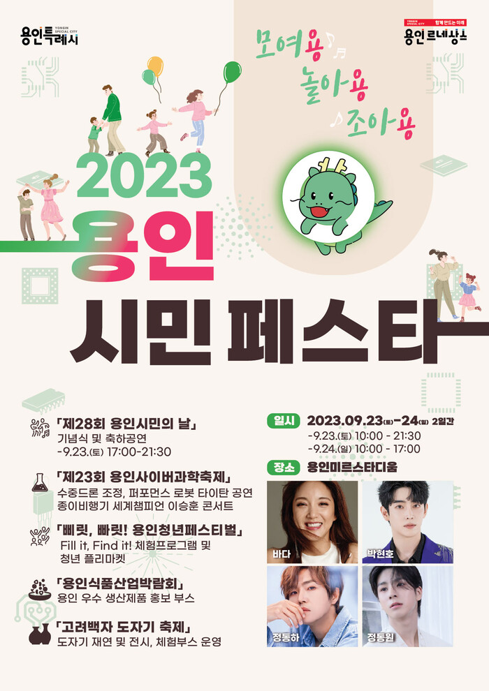 용인특례시(시장 이상일)가 용인시민의 자긍심을 높이고 화합을 다지는 대축제 ‘2023 용인시민 페스타 모여용!놀아용!조아용!’을 오는 23일부터 24일까지 용인미르스타디움에서 개최한다고 19일 밝혔다.