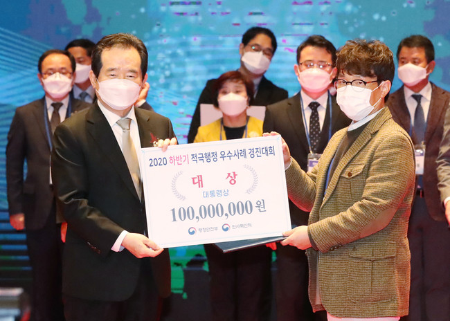 사진/지난 11월 18일 수원시 도시안전통합센터 이병호 주무관(오른쪽)이 정세균 국무총리로부터 적극행정 대상을 받고 있다.<수원시청 제공>