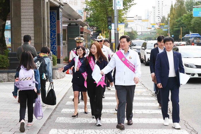 이 시장은 ‘멈추고, 살피고, 건너요’ 등 어린이 보행 수칙을 알리는 슬로건을 외치며 학생들에게 횡단보도를 안전하게 건너도록 당부하고 관련 홍보물도 나눠주는 등 소통하는 시간을 가졌다.