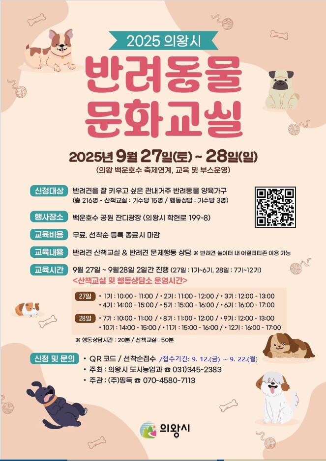 의왕시(시장 김성제)는 반려동물과 사람이 함께 행복하게 어울리는 도시 문화를 조성하기 위해 오는 9월 27일(토)부터 28일(일)까지 이틀간 백운호수공원에서 ‘2025년 하반기 반려동물 문화교실’을 운영한다고 밝혔다.