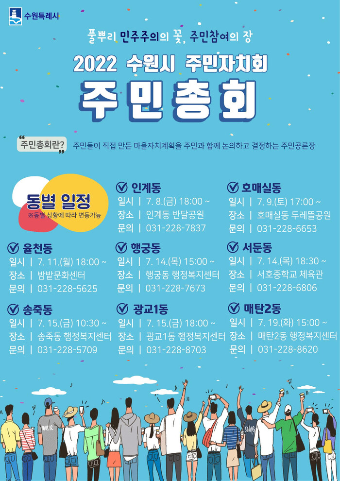 주민총회는 7월 8일 인계동(인계동 반달공원, 오후 6시)을 시작으로 ▲호매실동(호매실동 두레뜰공원, 9일 오후 5시) ▲율천동(밤밭문화센터, 11일 오후 6시) ▲행궁동(행궁동 행정복지센터, 14일 오후 3시) ▲서둔동(서호중학교 체육관, 14일 오후 6시 30분) ▲송죽동(송죽동 행정복지센터, 15일 오전 10시 30분) ▲광교1동(광교1동 행정복지센터, 15일 오후 6시) ▲매탄2동(매탄2동 행정복지센터, 19일 오후 3시)에서 이어진다.
