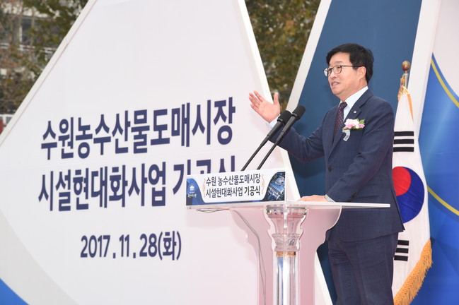 <사진/ 2017년 11월28일 수원농수산물도매시장 현대화사업 기공식에 참석한 염태영 시장이 인사말을 하고 있다.>