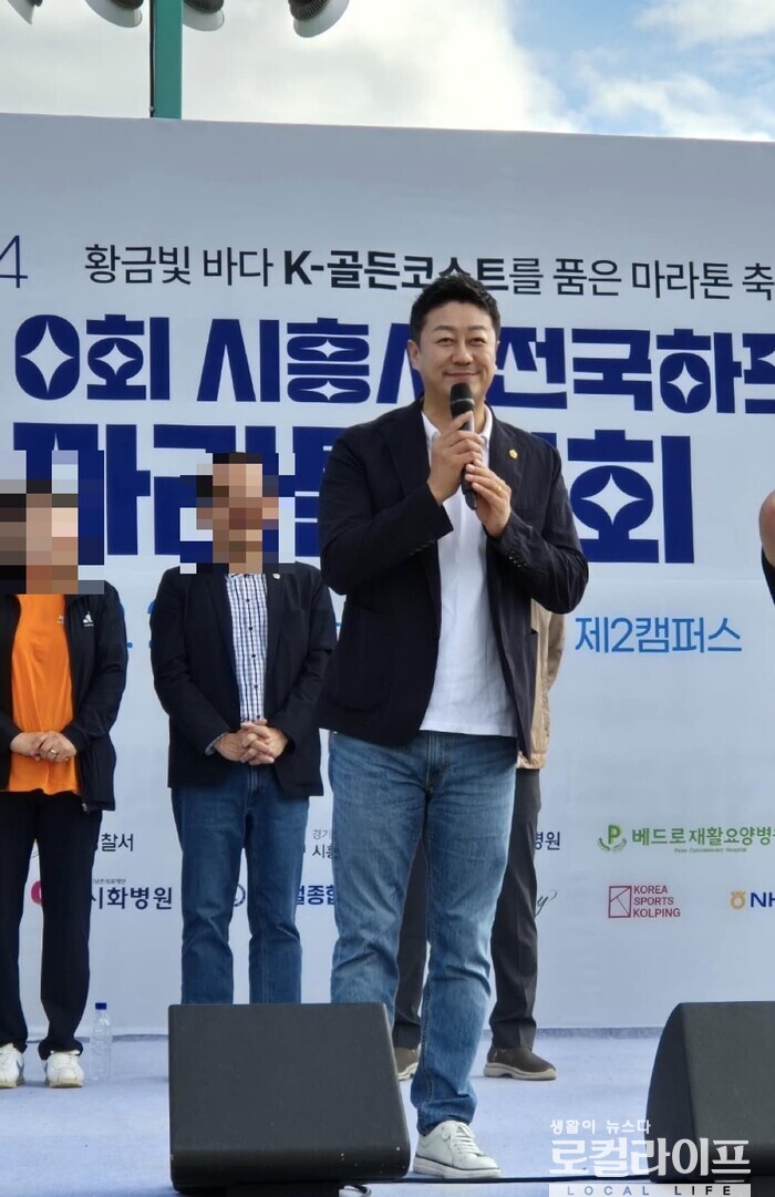 | ▲ 김진경 경기도의회 의장이 ‘2024 시흥시 전국 하프 마라톤대회’에 참석해 축사를 하고 있다. (사진출처=김진경 페이스북) |