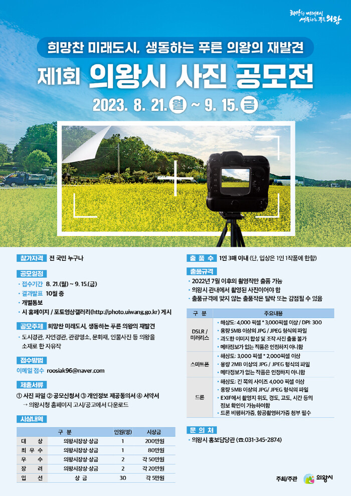 사진공모전과 관련한 자세한 사항은 의왕시홈페이지(고시/공고, 공지사항)를 확인하거나, 홍보담당관(031-345-2874)으로 문의하면 안내받을 수 있다.