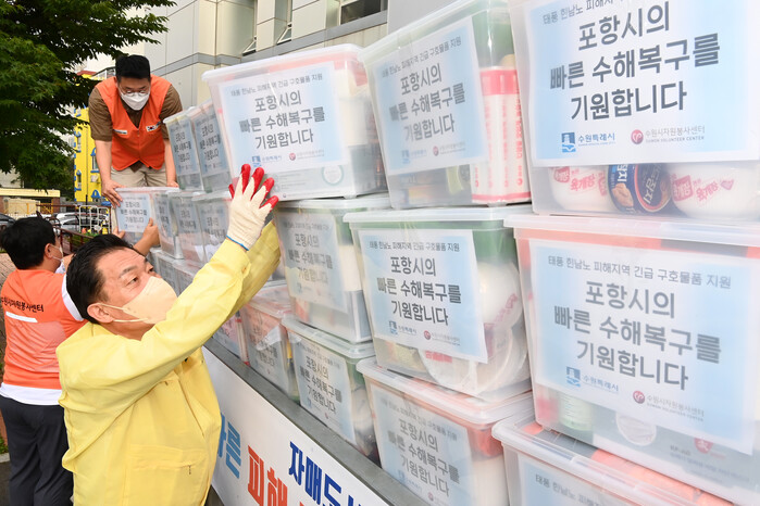 수원시가 태풍 힌남노로 인해 큰 피해를 본 포항시에 구호물품과 성금을 전달했다.