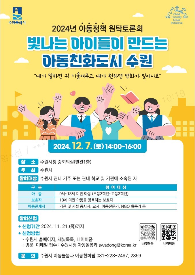 2024년 아동정책 원탁토론회는 ‘빛나는 아이들이 만드는 아동친화도시 수원’을 주제로 12월 7일 오후 2~4시 수원시청 중회의실에서 열린다. 아동, 학부모, 아동친화도시 추진위원회 위원, 아동시설 관계자 등 100명이 참여한다.