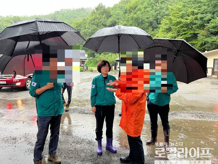| ▲ 김보라 안성시장이 호우 피해 현장을 찾아 점검하고 있다. (사진출처=김보라 페이스북) |
