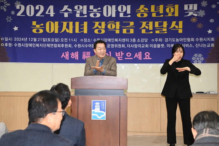 (사)한국농아인협회경기도협회 수원시지회는 21일 수원시장애인복지센터 소강당에서 송년회를 열고, 저소득층 농아 가정 자녀에게 장학금을 전달했다. 이재준 시장은 모범 장애인에게 표창을 수여했다.