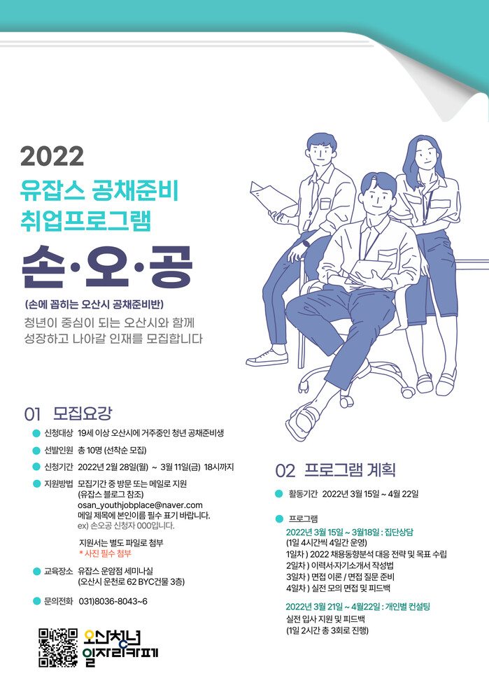 오산시(시장 곽상욱)는 최근 개관한 유잡스 운암점(운천로 62. 3층)에서 지난해에 이어 올해도 청년일자리 창출 촉진을 위한 유잡스 공채준비 청년취업 프로그램‘손·오·공’참여자를 3월 11일까지 모집한다고 2일 밝혔다.