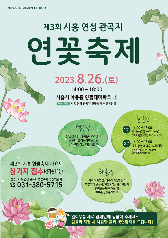 김용기 연꽃축제추진위원회 위원장은 “마을의 상징인 ‘연꽃’을 주제로 마을에 대한 애정을 높이고 주민들 간 화합할 수 있는 시간이 형성될 수 있도록 열심히 준비한 만큼, 시민 모두가 축제를 즐겨주시길 바란다. 아울러, 연꽃 축제가 시흥을 대표하는 축제로 거듭나길 희망한다”고 말했다.