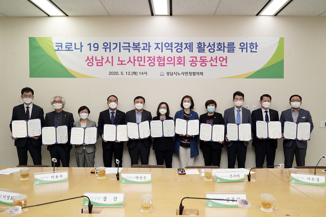 [성남=로컬라이프] 송준형 기자 = 성남시 노사민정협의회(위원장 은수미 성남시장)는 5월 12일 오후 2시 시청 2층 회의실에서 코로나19 경제 위기 극복과 고용안정을 위한 공동선언문을 발표했다.