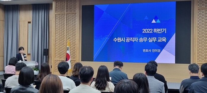 수원시 공직자들이 사용하는 ‘행정포털’에서 실시간 중계도 병행한 이번 교육에는 송무(訟務, 소송에 관한 사무나 업무) 관련 부서 공직자, 민원 업무 담당 공직자 등이 참여했다.