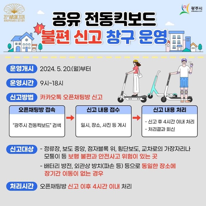 [경기 광주=로컬라이프] 송준형 기자 = 방세환 광주시장은 5일, 보행로, 버스정류장 등에 방치되어 불편을 끼치는 공유 전동킥보드! 이제 ‘카카오톡 오픈채팅방(광주시 전동킥보드 검색)’에 신고하시라고 전했다.