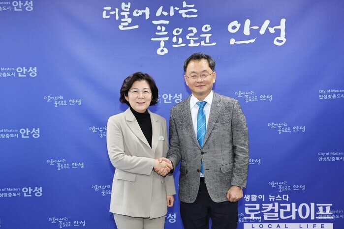 | ▲ 김보라 안성시장(왼쪽)과 민경선 경기교통공사 사장(오른쪽)이 인사를 나누고 있다. (사진출처=김보라 페이스북) |