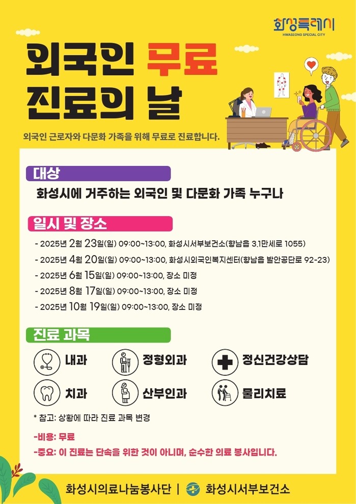 올해 무료 진료는 2월 23일, 4월 20일, 6월 15일, 8월 17일, 10월 19일 총 다섯 차례 운영되며, 첫 번째 진료는 화성시서부보건소에서, 두 번째 진료는 화성시외국인복지센터에서 진행된다. 나머지 일정의 장소는 추후 확정된다.