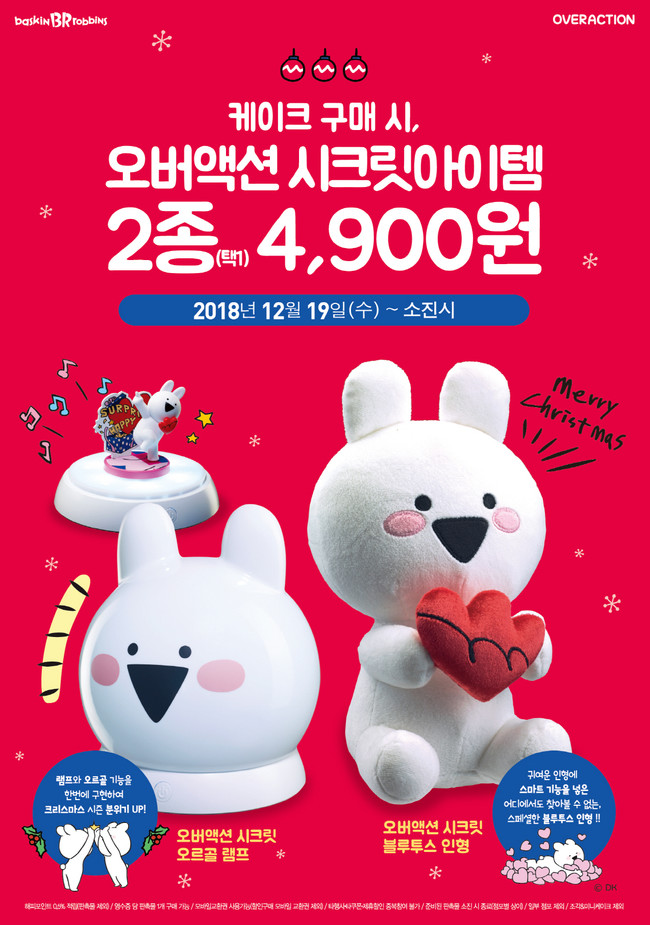 현재 배스킨라빈스는 ‘오버액션 시크릿 오르골 램프’, ‘오버액션 시크릿 블루투스 인형’으로 구성된 오버액션 시크릿아이템 2종의 프로모션을 진행 중이다. 인형, 램프 프로모션 모두 한정수량 제작되어 조기소진 될 수 있으니 구입을 원한다면 서두르는 것이 좋다.
