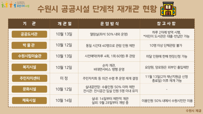 [로컬라이프] 정부가 ‘사회적 거리두기’ 단계를 10월 12일부터 1단계로 조정하면서 수원시가 공공시설을 제한적으로 개관한다.