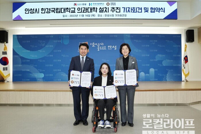 [안성=로컬라이프] 송준형 기자 = 안성시와 한경국립대학교는 안성시에 의과대학 및 대학병원을 설립하기로 하고 이를 위한 업무협약을 16일 체결했다.
