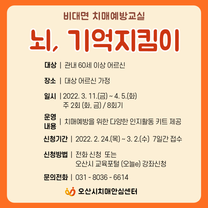 오산시치매안심센터가 오는 3월 11일부터 관내 60세 이상 어르신을 대상으로 비대면 치매예방교실‘뇌, 기억지킴이’를 운영한다고 2일 밝혔다.