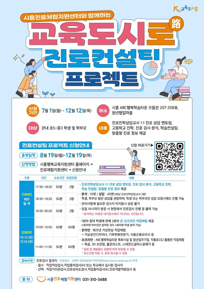 시흥시(시장 임병택)는 시흥진로체험지원센터와 함께 ‘2024 시흥 교육도시로(路) 진로 컨설팅 프로젝트’를 시흥ABC행복학습타운에서 오는 8월 19일부터 진행하며, 7월 1일부터 신청을 받고 있다.