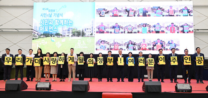 이어진 ‘시민과 함께하는 특별 퍼포먼스’에서는 김동근 시장을 비롯한 내빈들이 ‘우리가 더 사랑하게 될 의정부, 여러분이 주인공’이라는 문구가 적힌 피켓을 들고, 시민들과 함께 무대에 올라 하나 된 모습을 연출했다. 이 장면은 대형 화면을 통해 실시간으로 중계되며 현장을 감동으로 물들였다.